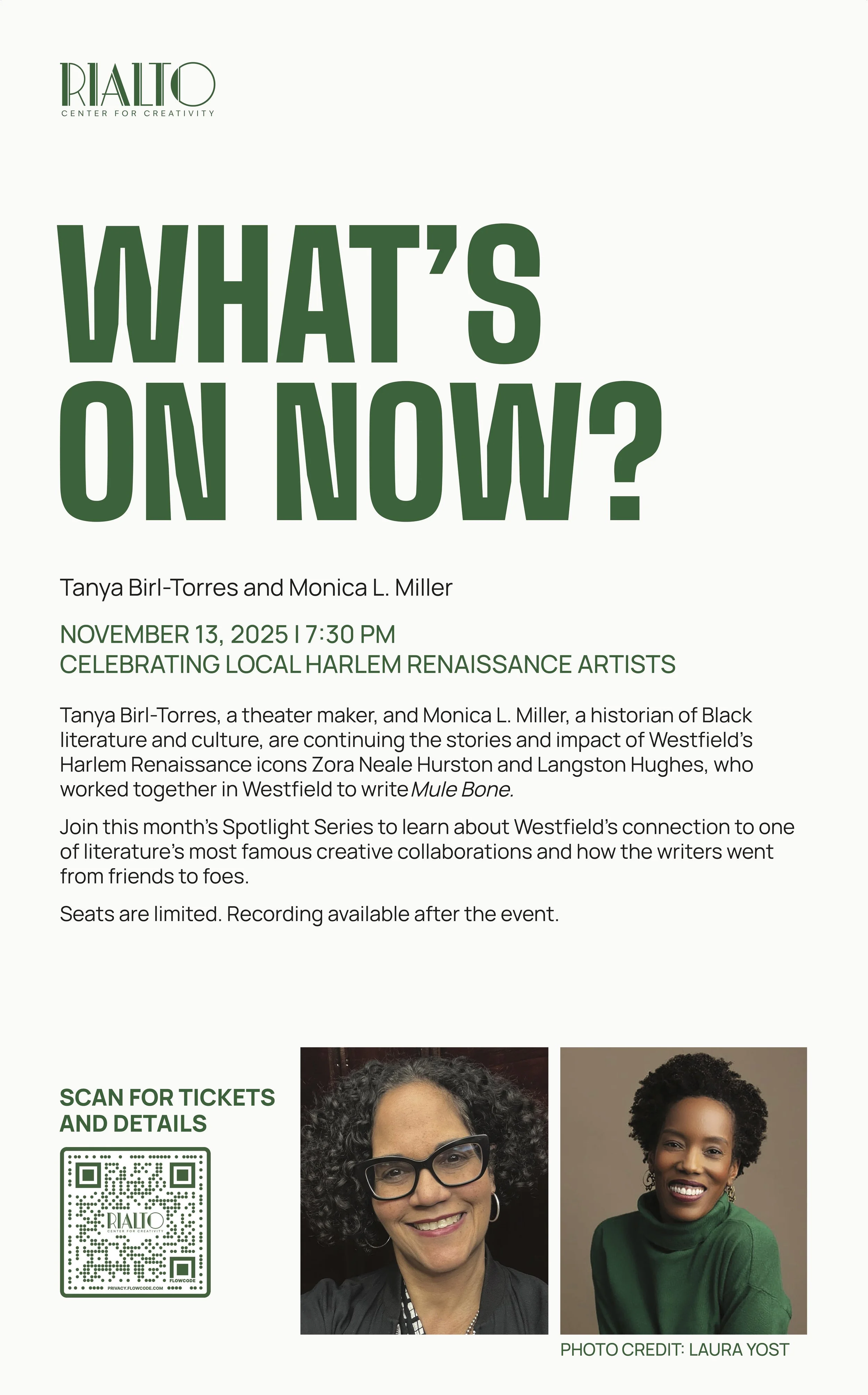 WESTFIELD, NJ – October 2025 - The Rialto Center for Creativity’s Spotlight Series continues on Thursday, November 13, 2025, at 7:30 p.m., bringing audiences a powerful evening of history, art, and storytelling centered on Westfield’s role in the Harlem Renaissance. The second event in the series will feature Tanya Birl-Torres, a theater maker and choreographer, and Monica L. Miller, a leading scholar of Black literature and culture, as they explore the creative partnership and enduring impact of Zora Neale Hurston and Langston Hughes—two literary giants who once lived and collaborated right here in Westfield.